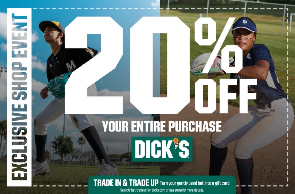 Save the date! Our partner DICK’S Sporting Goods is offering all our members an exclusive discount of 20% off throughout the store! Be sure to grab all the things you will need for the season as well as all the other items that you have had your eyes on! To access exclusive savings, click the coupon linked below. The coupon is valid in-store on the dates above and must be shown at the register during checkout. Please consider taking advantage of the additional shopping days that were added to provide more flexibility.